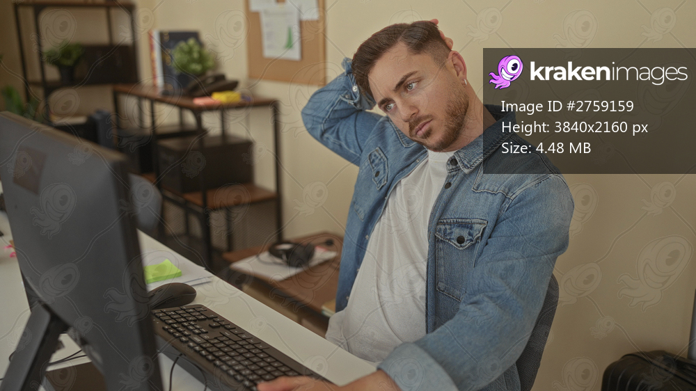 Young man with beard sitting in an office stretching and reflecting at a desk with computer and shelves in background, capturing a moment of workday relaxation and contemplation. - Kraken Images