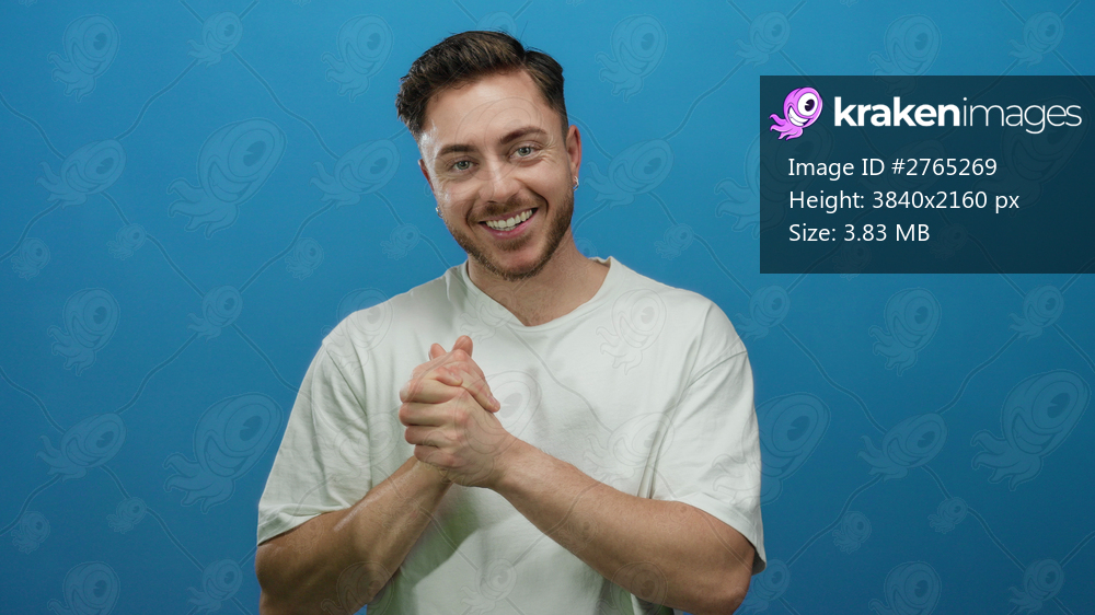 Young man with beard smiles warmly, wearing white shirt against a vibrant blue background, showcasing a friendly, approachable demeanor perfect for corporate or lifestyle contexts. - Kraken Images