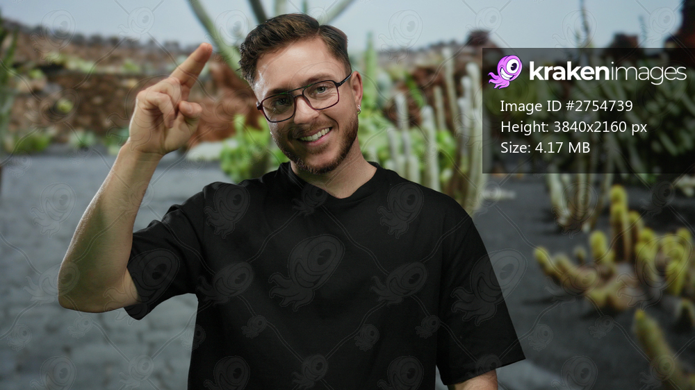 Young man with beard smiling in park setting, gesturing with fingers on forehead, wearing glasses and black shirt, surrounded by green plants and stone walls outdoor. - Kraken Images