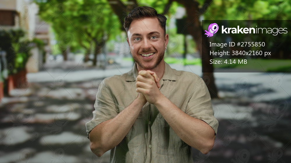 Young man with beard smiling in summer on a sunny street in a city park with green trees in the background, wearing a relaxed shirt and displaying a cheerful expression - Kraken Images