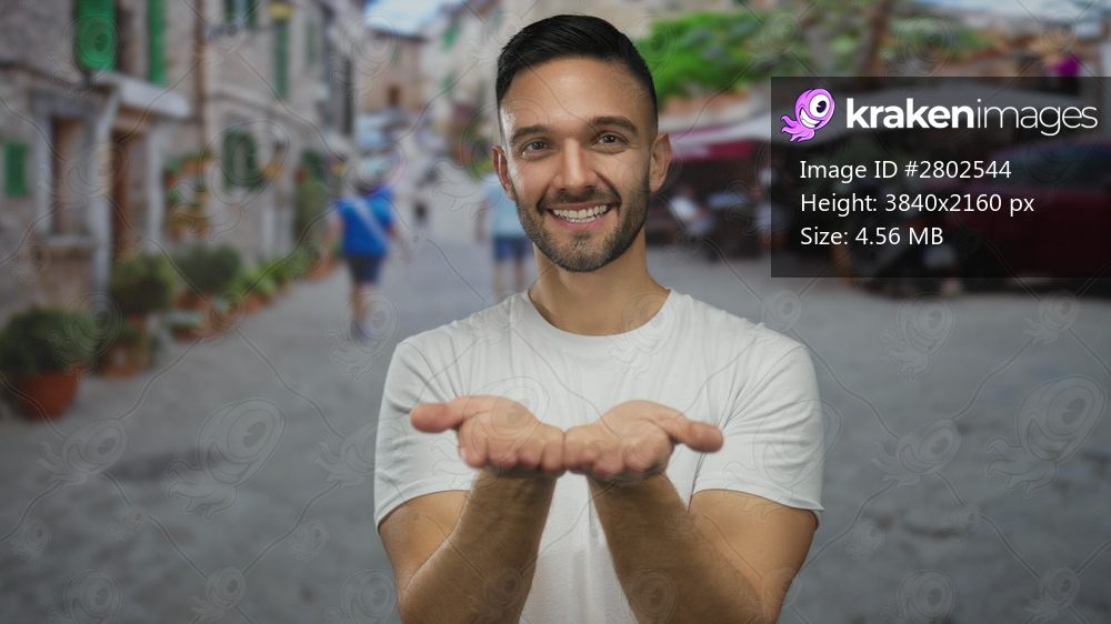 Young man with beard smiling in urban street setting outdoors wearing white shirt with hands extended forward showcasing open gesture and friendly expression in summery city environment. - Kraken Images
