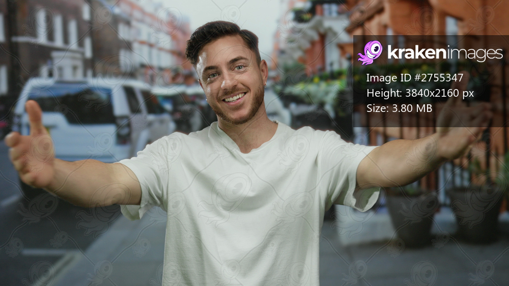 Young man with beard smiling on a city street with arms open, wearing white shirt, standing outdoors against a backdrop of urban architecture and parked vehicles. - Kraken Images