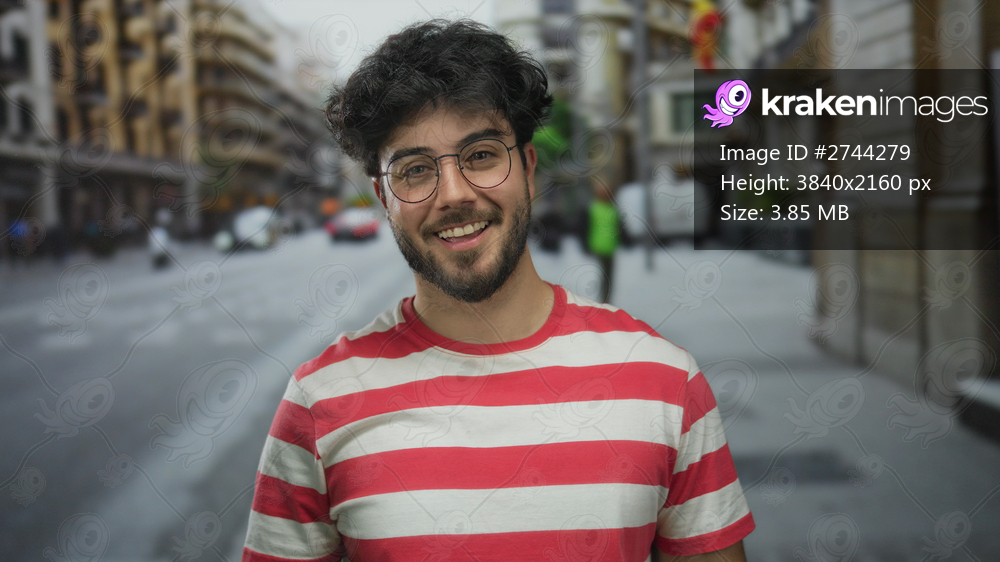 Young man with beard smiling outdoors on a busy street in an urban city, wearing glasses and a striped shirt with people in the background.