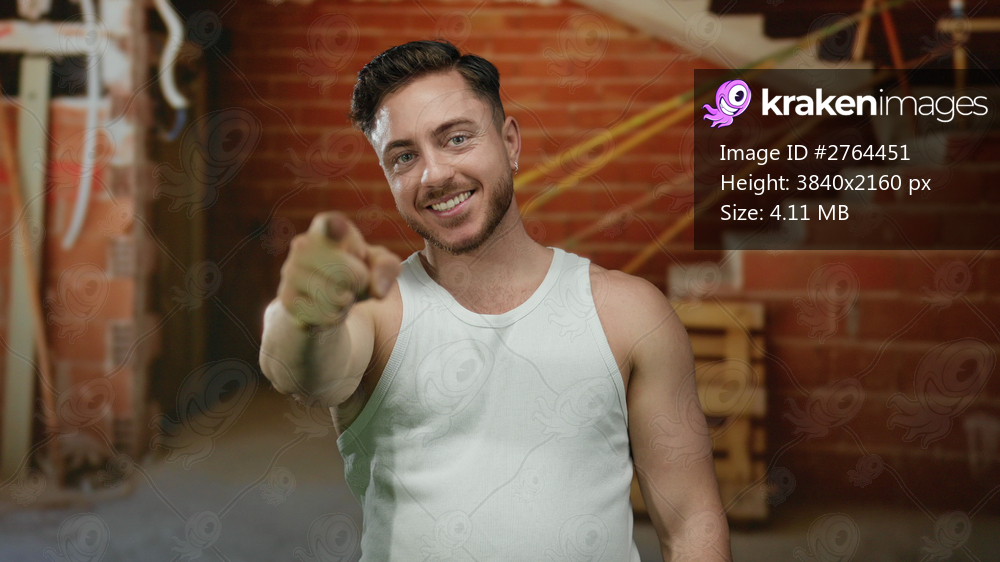Young man with beard smiling and pointing at the camera indoors on a construction site with exposed brick and equipment in the background suggesting a relaxed atmosphere. - Kraken Images