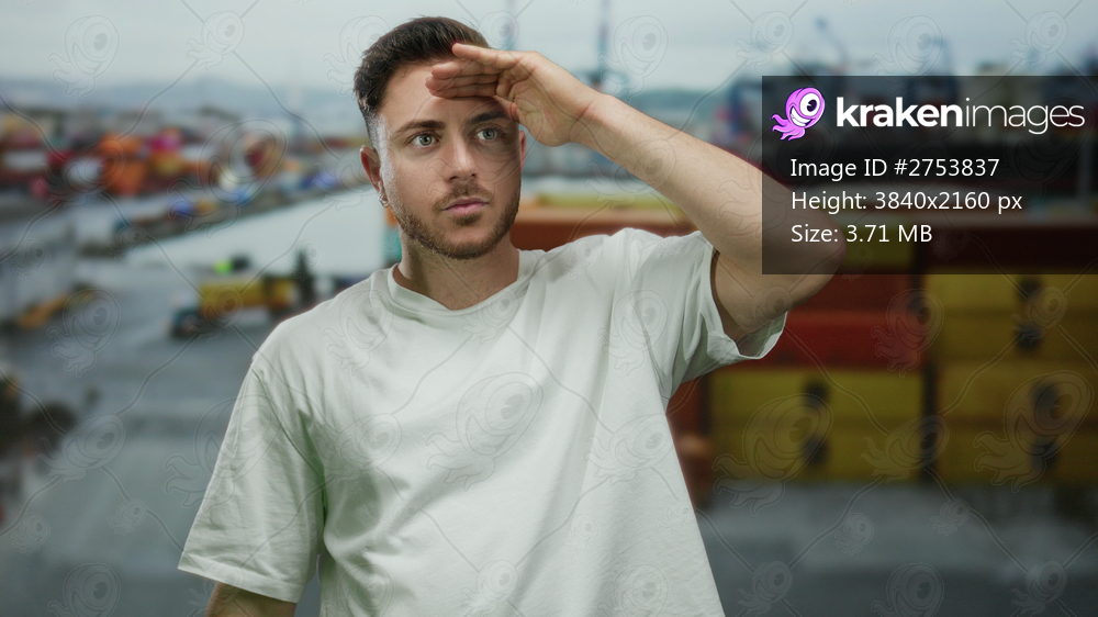 Young man with beard standing at port overlooking the sea, wearing white shirt, with ships and containers in the background, capturing a sense of adventure and exploration. - Kraken Images