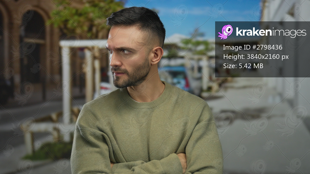 Young man with beard standing on urban street with thoughtful expression wearing casual sweater under blue sky in busy city background.