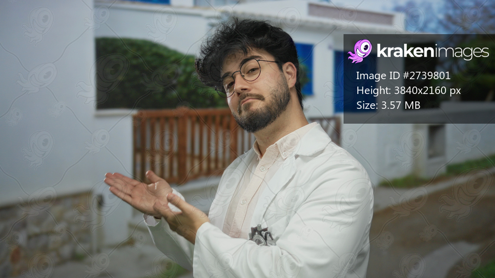 Young man with beard standing outdoors on a sunny day wearing glasses and a white coat, appearing focused and engaged with his surroundings.