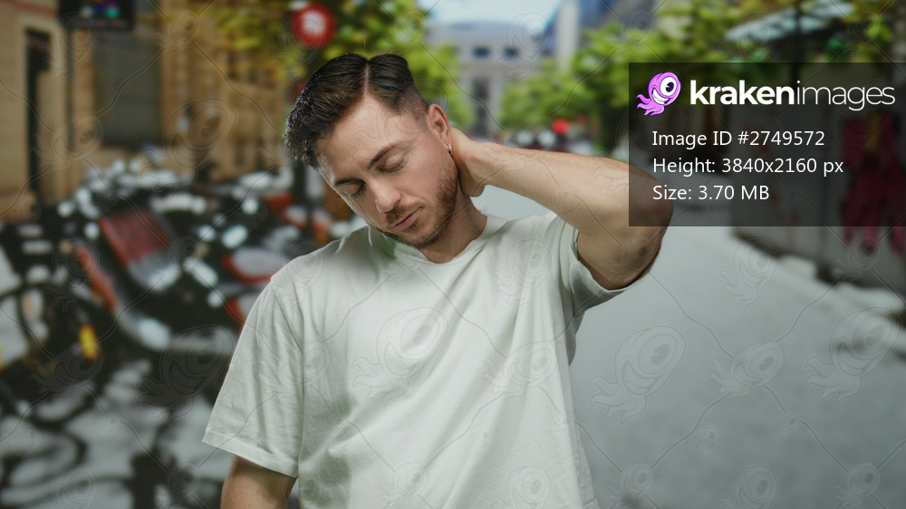 Young man with beard stands contemplatively on a lively city street, surrounded by vibrant greenery and urban scenery, reflecting modern outdoor life.