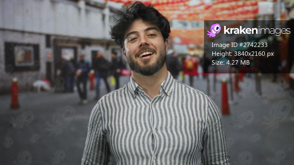 Young man with beard stands on busy street, showcasing urban lifestyle in a vibrant outdoor setting with diverse people and festive decorations in the background. - Kraken Images