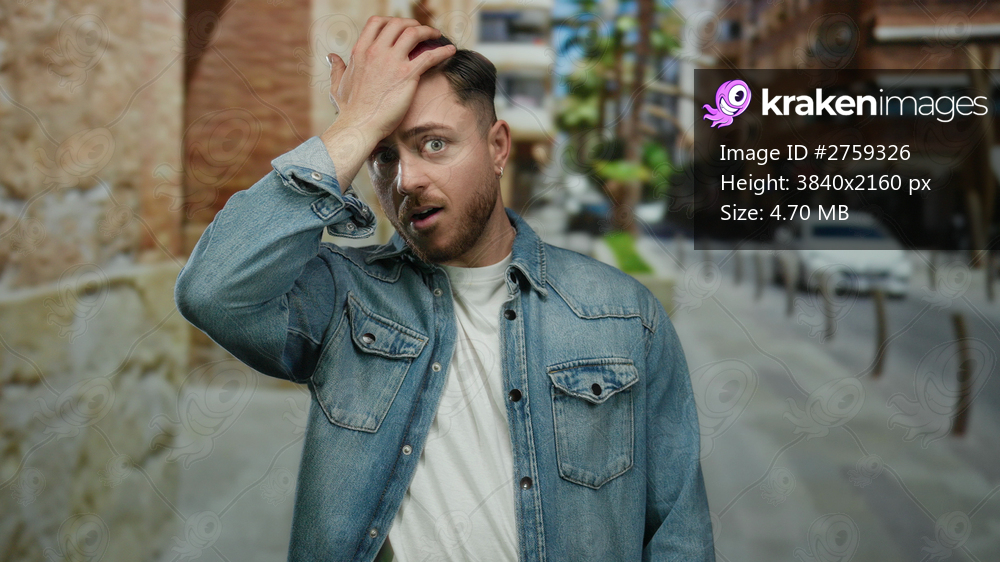 Young man with beard stands on city street looking frustrated under sunlight wearing denim shirt and white t-shirt outdoors against urban background.
