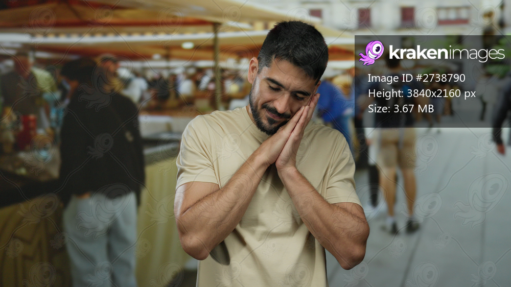 Young man with beard stands relaxed in a bustling outdoor market surrounded by people shopping on a sunny day, capturing a vibrant urban atmosphere.