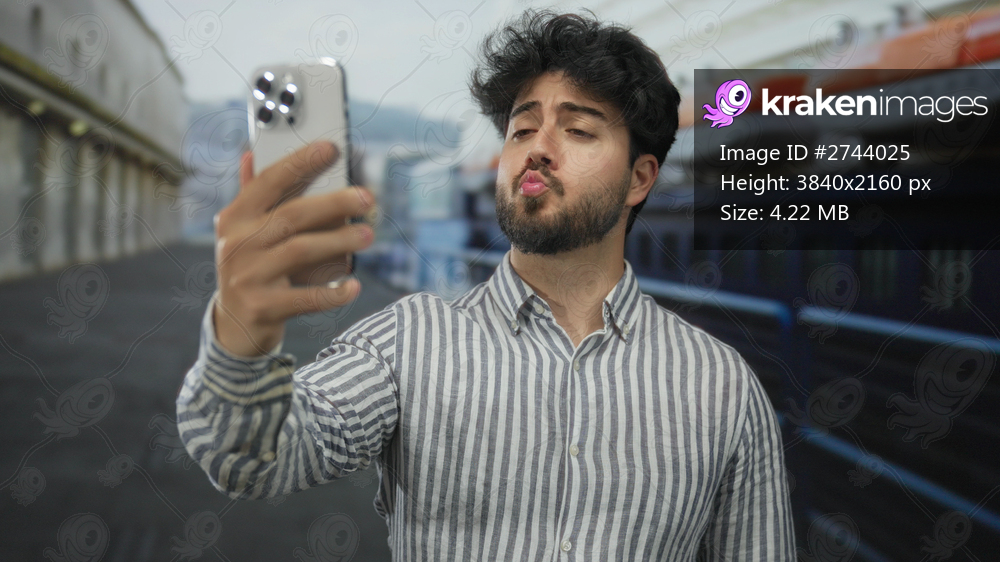 Young man with beard takes selfie on cruise ship deck, capturing his relaxed hispanic look against the backdrop of lifeboats and maritime views, embodying travel and technology. - Kraken Images