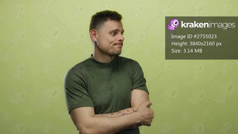 Young man with beard and tattoos stands isolated against a yellow background expressing indecision and contemplation while wearing a casual green shirt. - Kraken Images