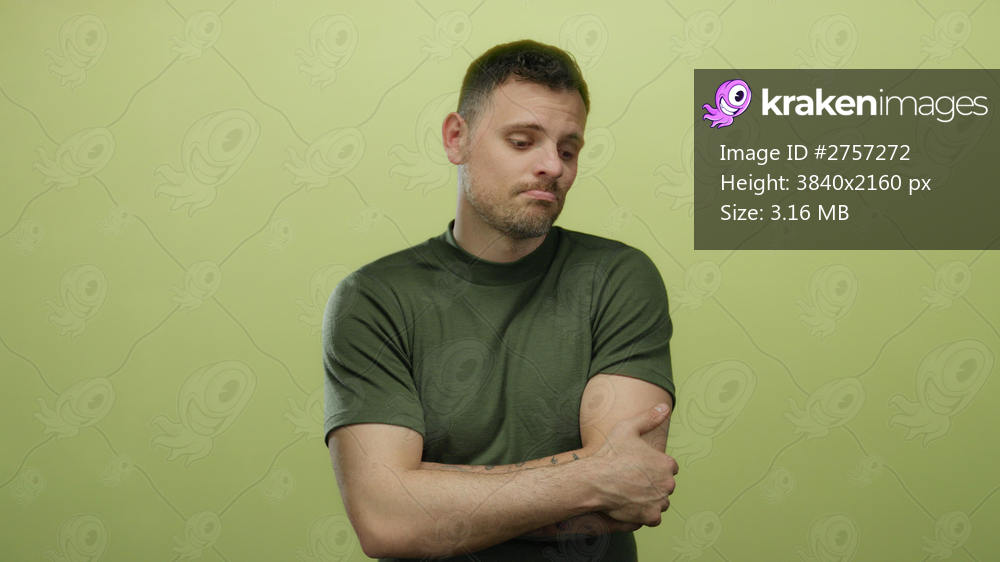 Young man with beard and tattoos stands isolated against a yellow background expressing indecision and contemplation while wearing a casual green shirt. - Kraken Images