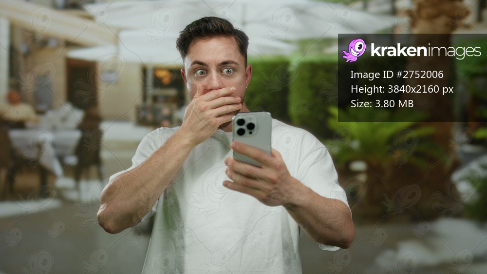 Young man with beard using smartphone on terrace of outdoor restaurant in city capturing candid moment of surprise and communication in urban setting.