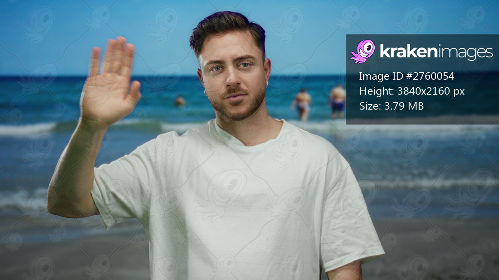 Young man with beard waving at the camera on a sunny beach with people in the background enjoying the seaside and the ocean waves under a clear blue sky, wearing casual white shirt. - Kraken Images
