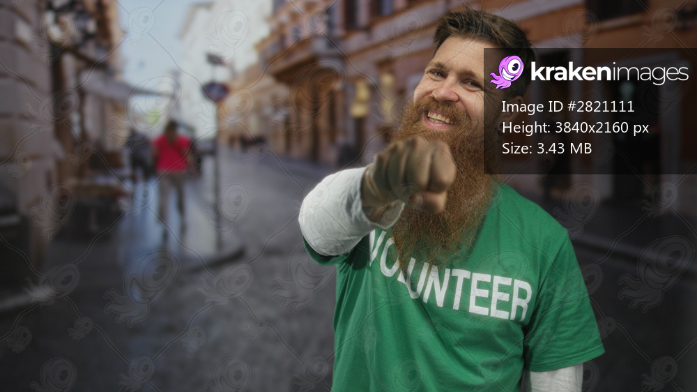 Young man with beard wearing a green volunteer shirt pumping fist in front of city street; enthusiasm.