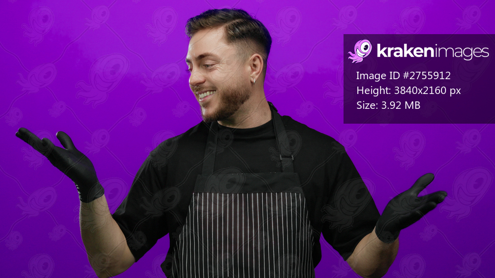Young man with beard wearing apron and gloves, smiling against isolated purple background, embodying a cheerful waiter look.