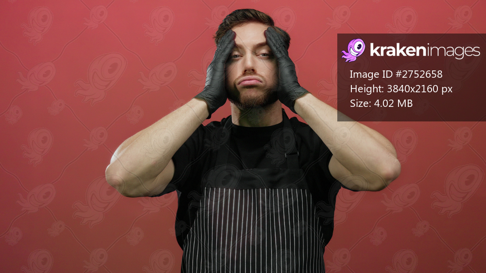 Young man with beard wearing apron and gloves stands against isolated red background looking frustrated and thoughtful.