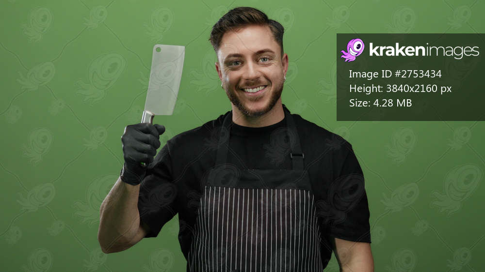 Young man with beard wearing apron holds a cleaver in gloved hand against a green wall background smiling confidently.