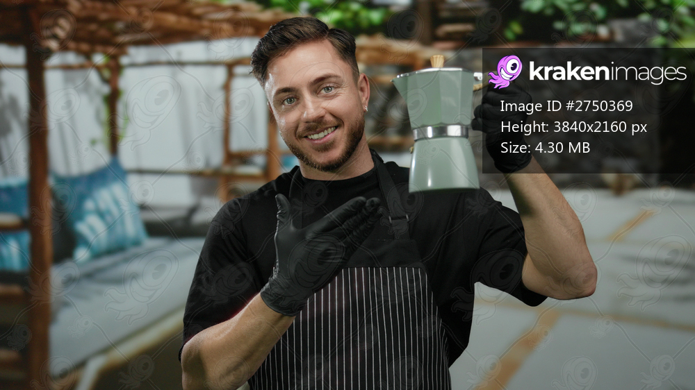 Young man with beard wearing apron smiles while holding coffee maker outdoors in a city street showcasing his work as a waiter in a french cafe.