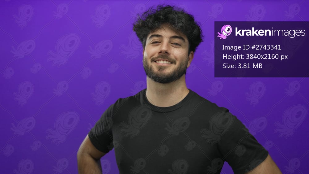 Young man with beard wearing black shirt in front of purple background smiling confidently in studio setting, showcasing casual style and positive attitude. - Kraken Images