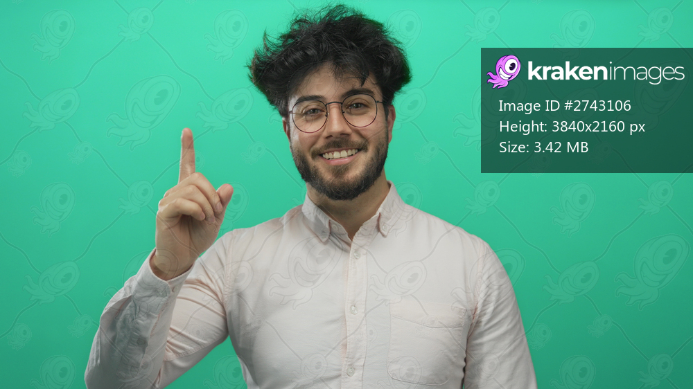 Young man with beard wearing glasses points upward against a vibrant green background, exuding curiosity and positivity.