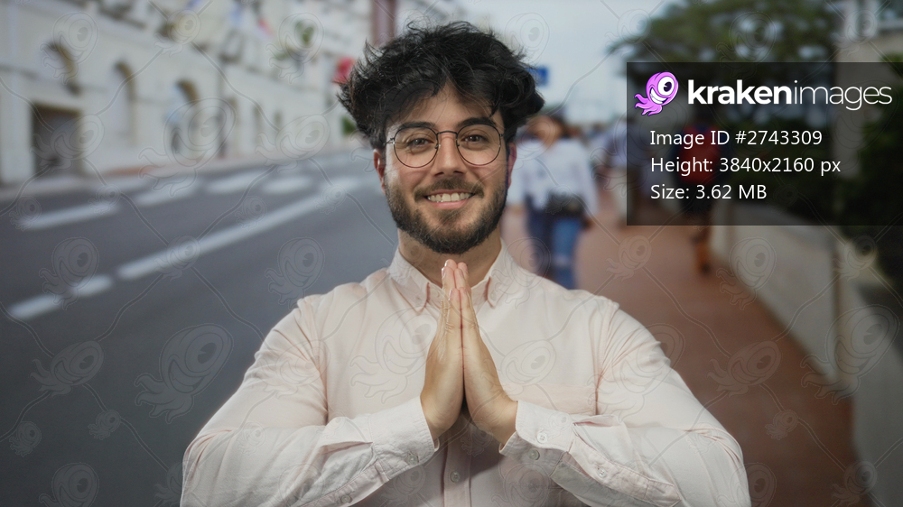 Young man with beard wearing glasses smiles while standing outdoors with hands in a prayer gesture on a busy street