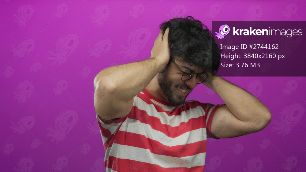 Young man with beard wearing glasses and striped shirt expressing frustration with raised hands against pink background in studio lighting, indicating confusion and stress. - Kraken Images