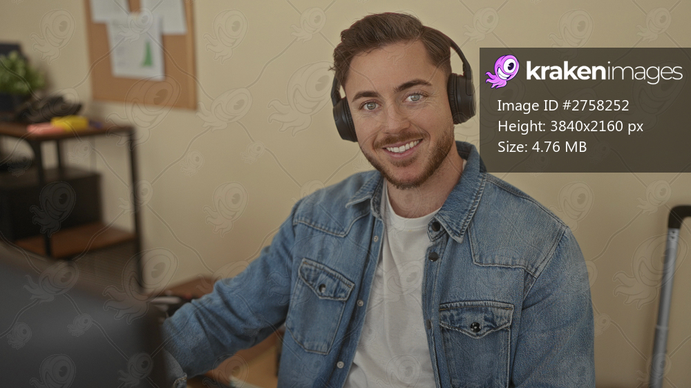 Young man with beard wearing headphones in an office setting, focused on work at computer in an indoor workplace environment, featuring casual attire and modern equipment. - Kraken Images