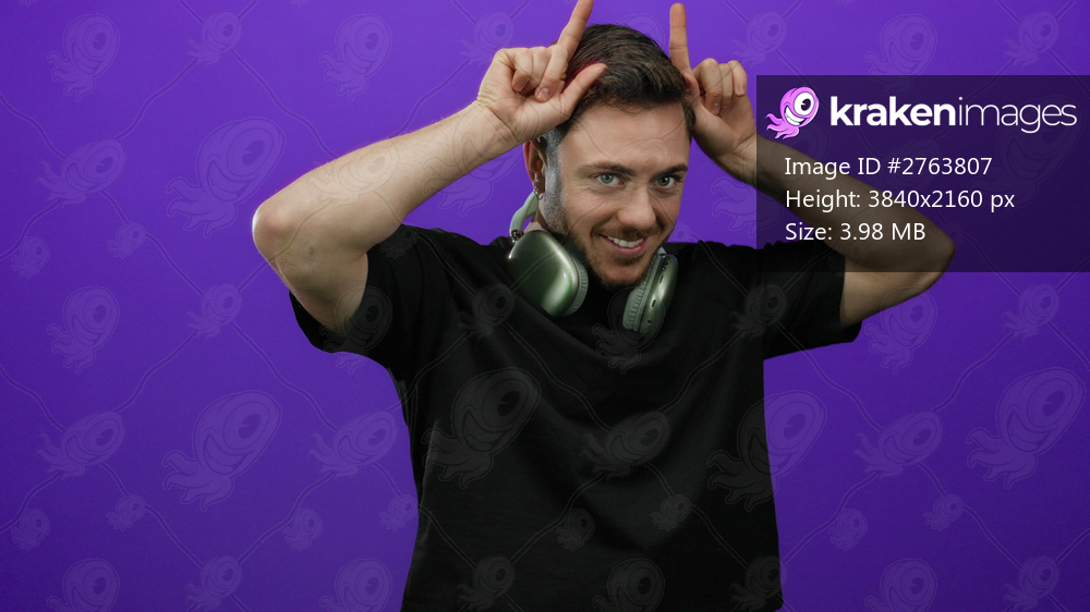 Young man with beard wearing headphones makes playful horn gesture against purple wall in isolated setting, showcasing fun, isolated, casual, expressive, playful, and modern vibe. - Kraken Images