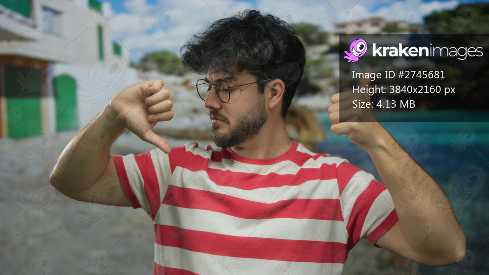 Young man with beard wearing striped shirt gestures thumbs up and down on seaside with building and ocean in background indicating mixed emotions outdoors. - Kraken Images