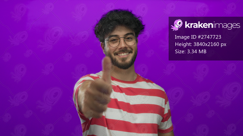 Young man with beard wearing striped shirt and glasses smiling confidently with thumbs up against vibrant purple background.