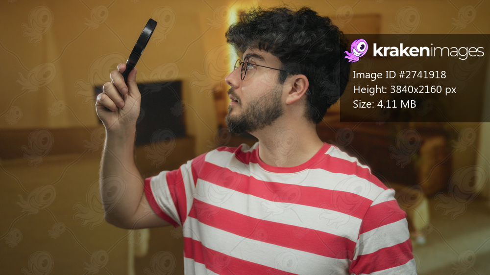 Young man with beard wearing striped shirt looking through magnifier in cozy room with warm lighting and indoor decor around him.