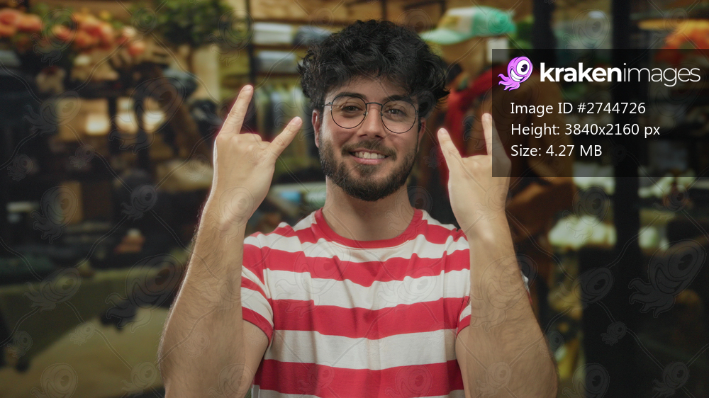 Young man with beard wearing striped shirt makes rock gesture in a clothing store with vibrant background