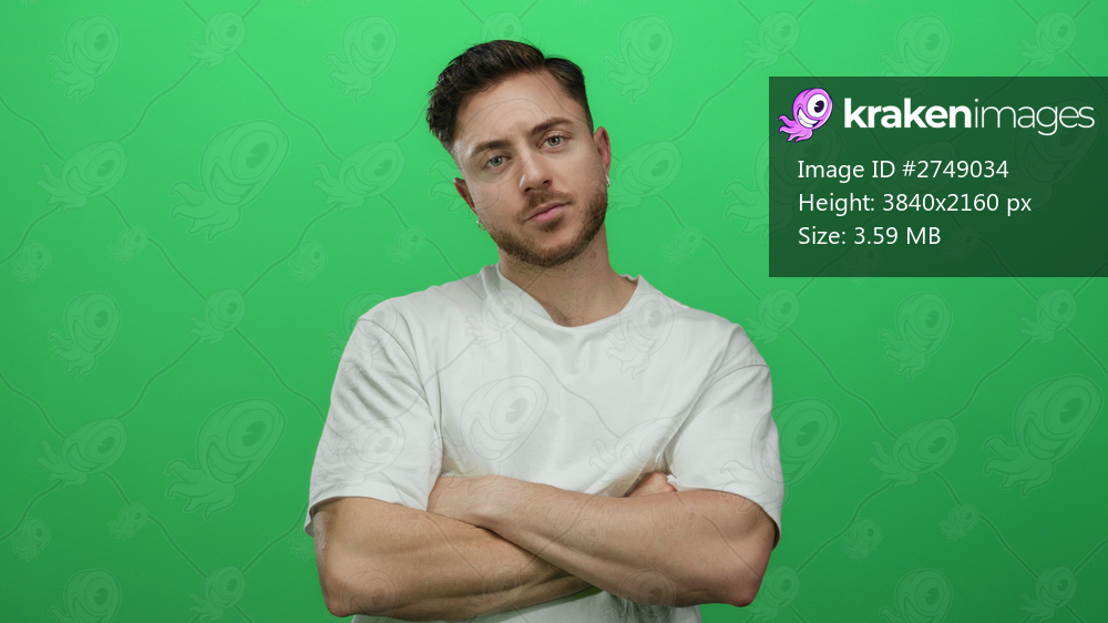 Young man with beard and white shirt stands thoughtfully against isolated green background wall posing with folded arms in contemplative attitude.