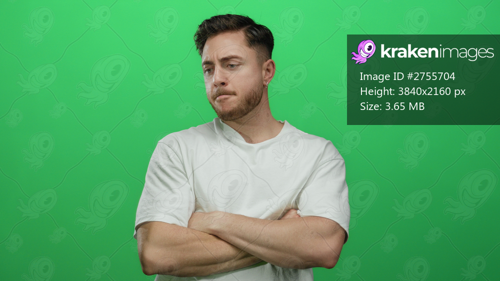 Young man with beard and white shirt stands thoughtfully against isolated green background wall posing with folded arms in contemplative attitude.