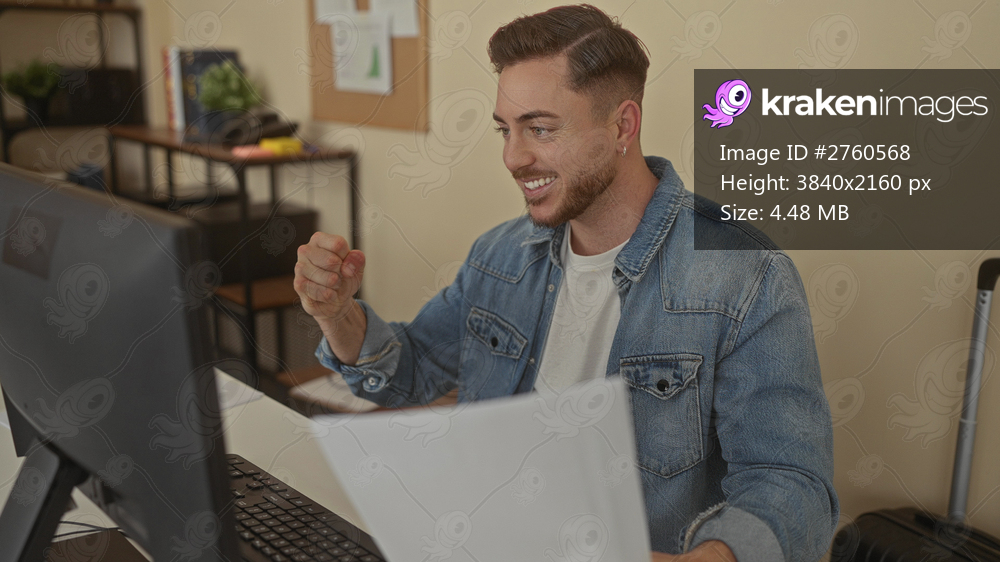 Young man with beard working in office, focused on computer screen, wearing denim jacket and reading papers in a professional indoor setting with shelves in background. - Kraken Images