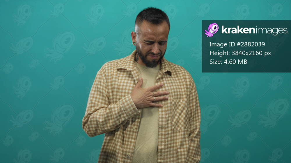Young man bearded in checkered shirt clutching chest with a pained grimace in teal studio; pain recovery.