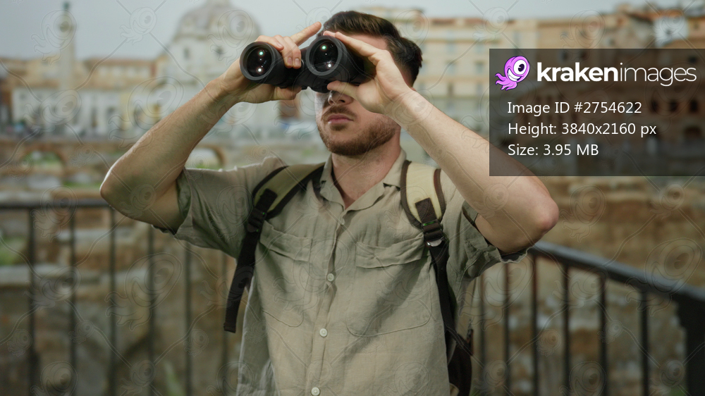 Young man with binoculars and backpack explores roman ruins, capturing the essence of a tourist adventure in an outdoor historical setting.