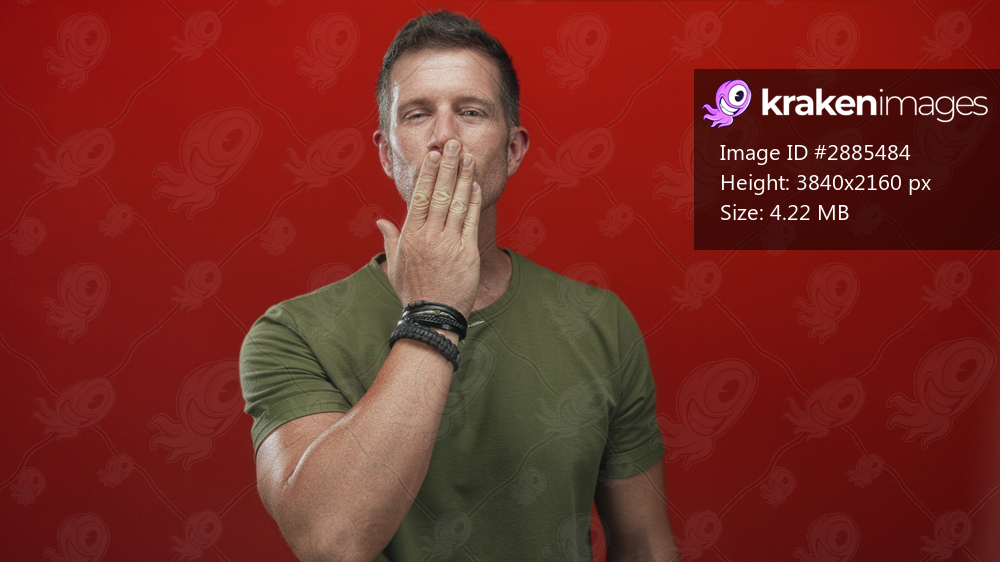 Young man blowing a kiss with hand to mouth and open palm extended toward camera in red studio; affection warmth greeting.