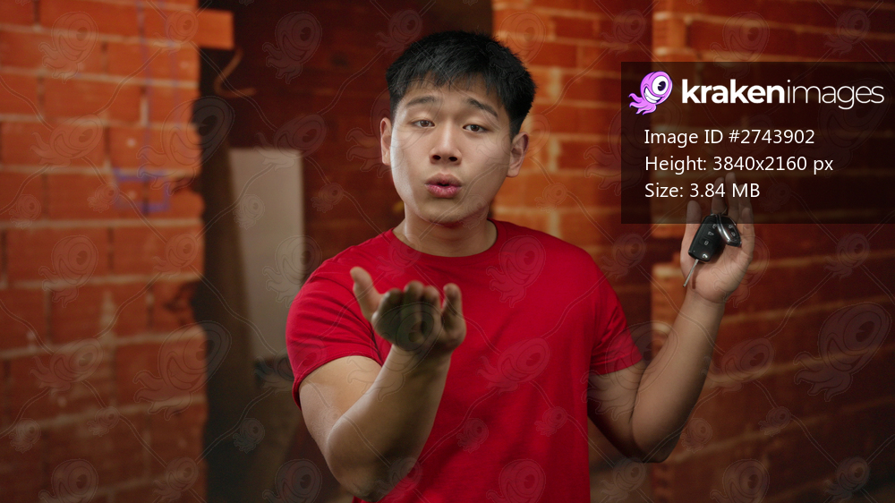 Young man blowing kiss at indoor construction site, holding keys, wearing red shirt, against brick wall backdrop, expressing affection in industrial setting with casual demeanor. - Kraken Images