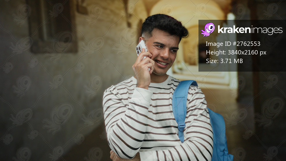 Young man with blue backpack talking on phone in historic university corridor smiling and enjoying conversation in relaxed atmosphere