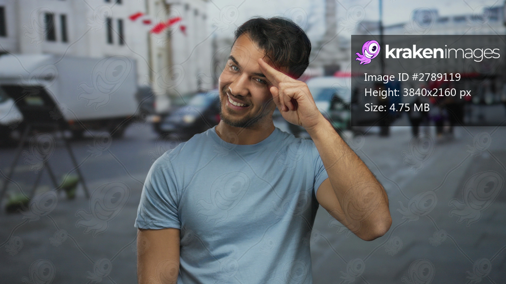 Young man with blue shirt making victory sign on busy city street with traffic and flags in the background, conveying positivity and friendliness in an urban outdoor setting. - Kraken Images