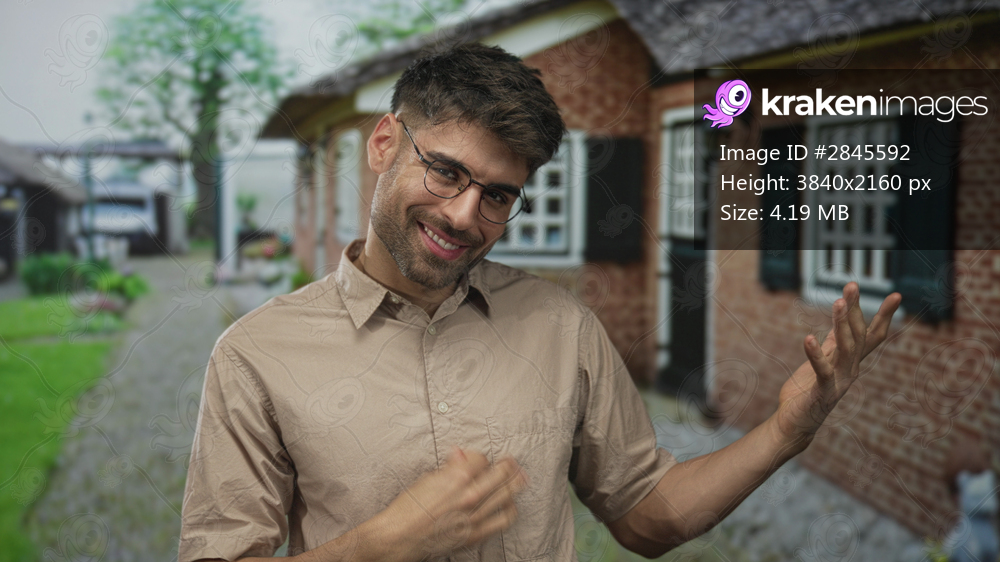 Young man casually uses hand to play air guitar gesture at building entrance on a sunny morning; imagination playfulness fun joy.
