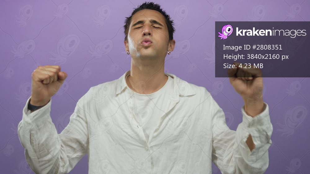 Young man celebrating with closed eyes and raised fists in front of an isolated purple background, wearing a white shirt and expressing strong emotions. - Kraken Images