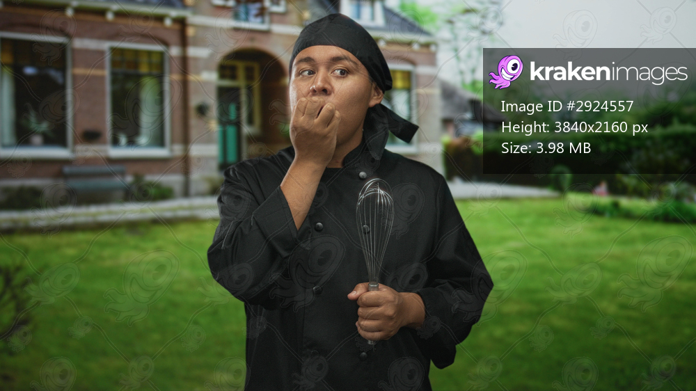Young man chef in black uniform and headscarf holding whisk with hand to mouth at building entrance of a house outdoors; hesitation.