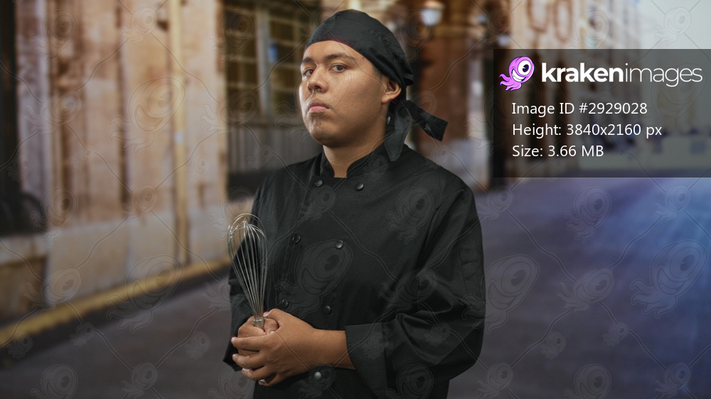 Young man chef in black uniform holds whisk with folded hands on old town street near building facades; quiet determination.