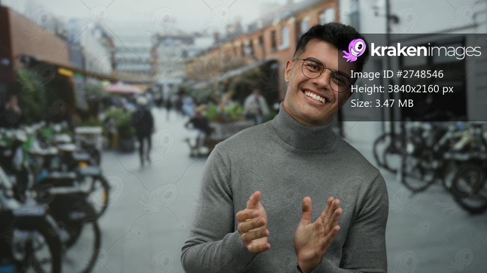 Young man clapping hands in a lively outdoor city street wearing glasses and a sweater with people and bicycles in the background showcasing a vibrant urban environment. - Kraken Images