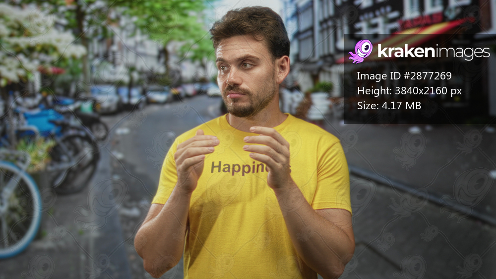 Young man clapping hands in a yellow t shirt on a city street lined with bicycles and outdoor cafe tables, hands held near chest; thoughtful reflection. - Kraken Images